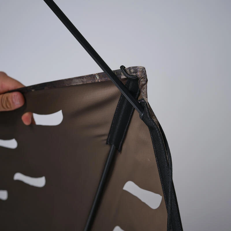 Afin d’augmenter sa hauteur, il est possible d’ajouter le bandeau de camouflage en mesh supplémentaire. (Hauteur de l’affût avec la bande : 170cm et longueur: 135cm). Ce bandeau permet de voir à travers tout en restant dissimulé derrière l’affut.
