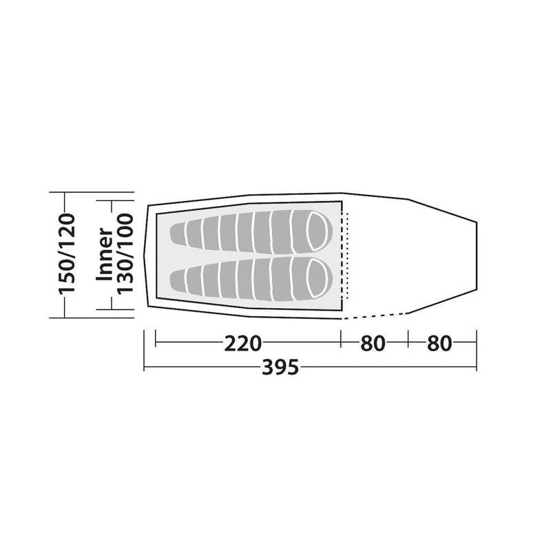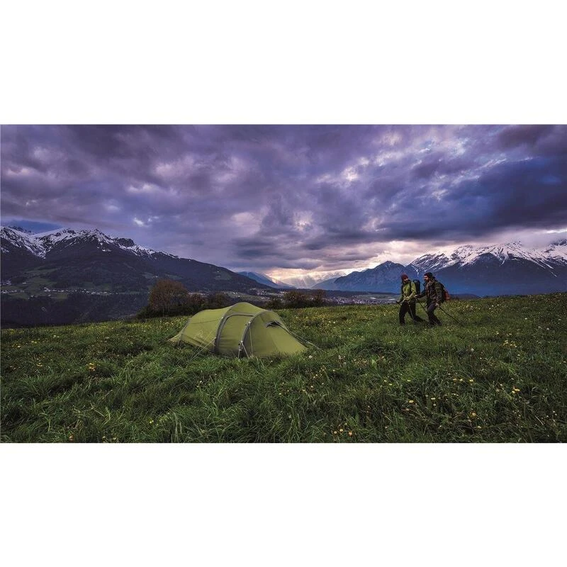 Tente tunnel robuste pour 2 personnes avec entrée latérale et auvent spacieux avec auvent étendu pour le matériel, la cuisine et le repas.
